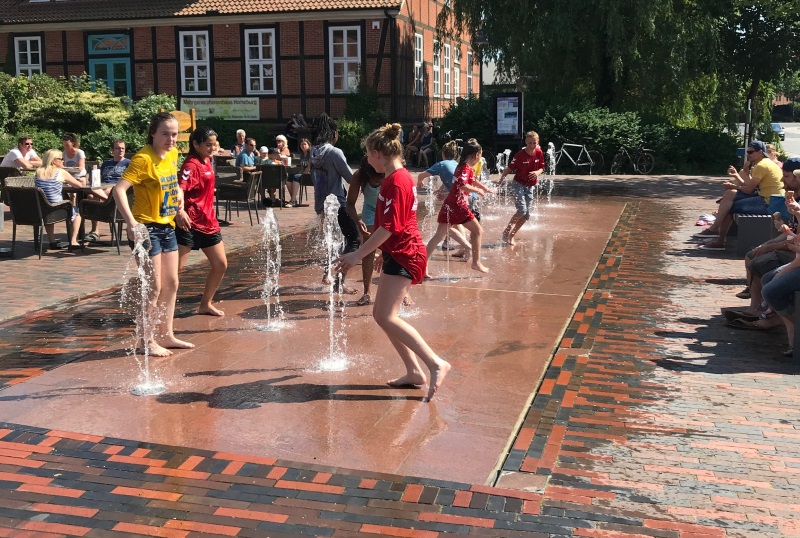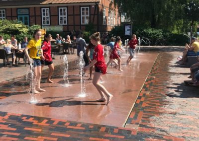 Die Rückfahrt war entsprechend ausgelassen und in Horneburg angekommen, ging es ins Eiscafé Dante. Hier wurde die Saison mit einem Eisbecher und der (bei knapp 30°C) unvermeidbaren Wasserdusche oder besser Wasserbad im Wasserspiel vor Dante abgeschlossen…