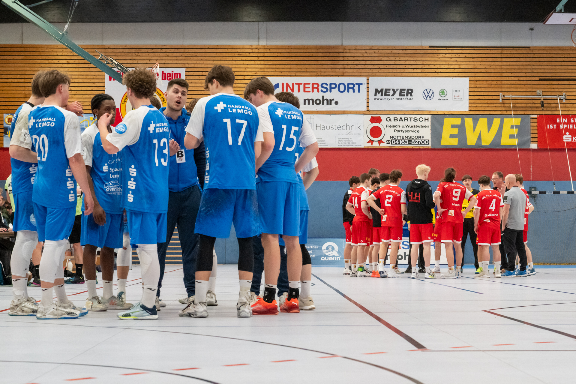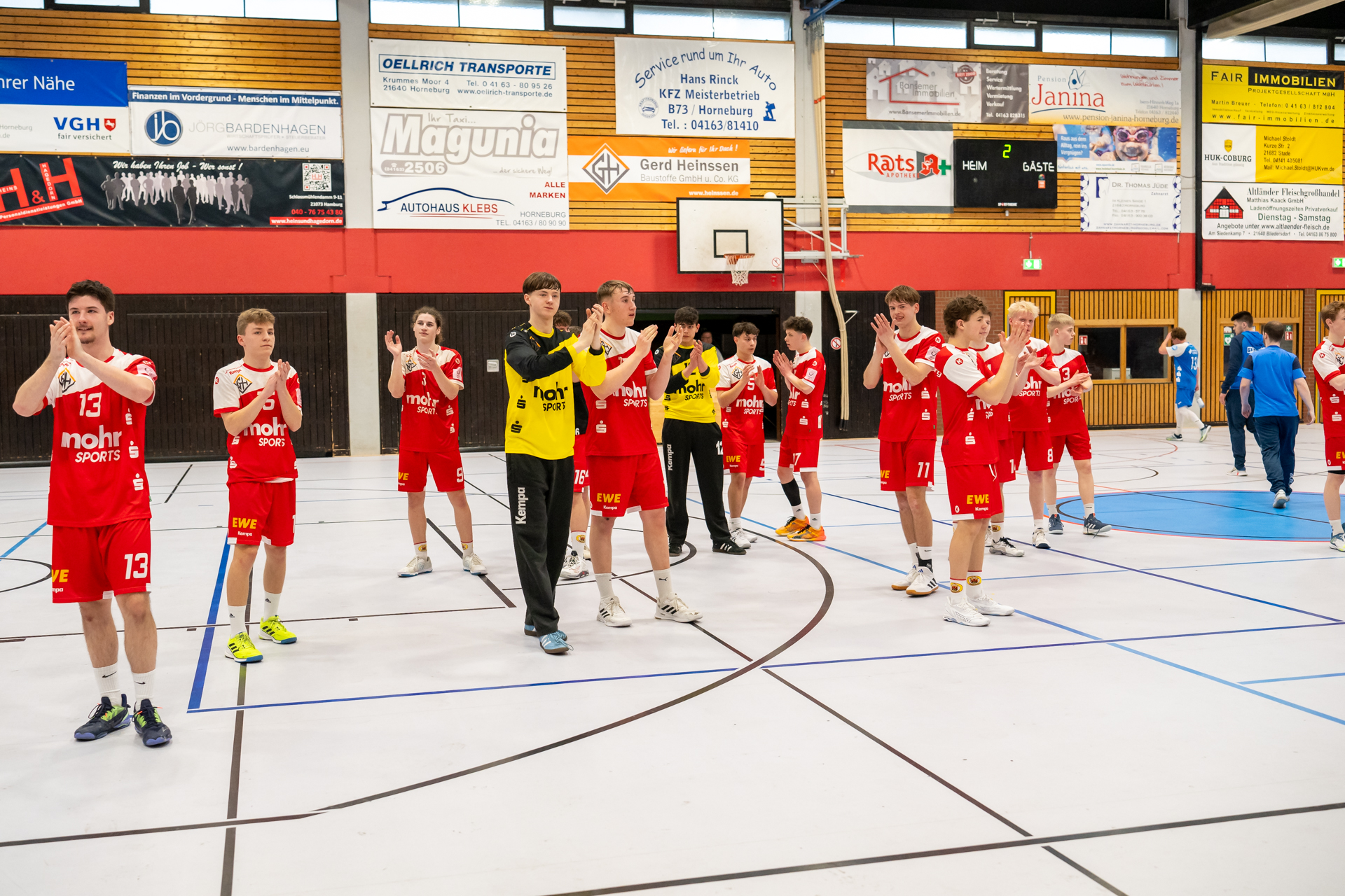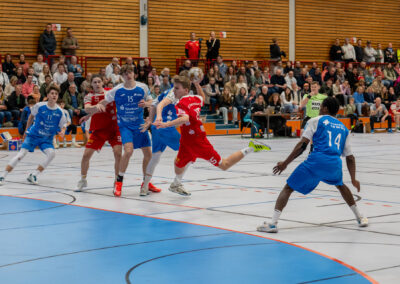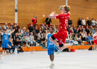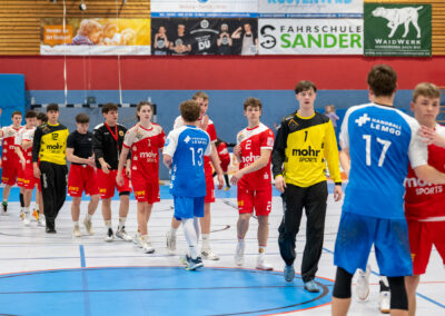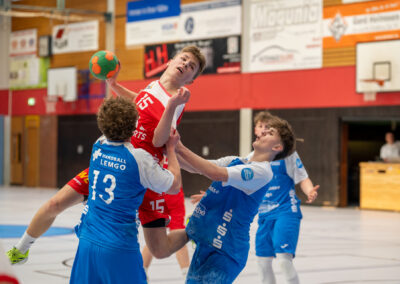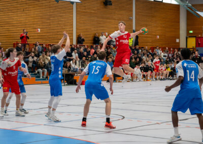 Einen am Ende ungefährdeten 46:37 (21:16) Heimsieg hat die A-Jugend gegen den Tabellendritten Lemgo eingefahren und bleibt damit zwei Spieltage vor Schluss weiterhin mit einem Punkt Vorsprung an der Tabellenspitze vor dem VfL Gummersbach. Das Horneburger Team spielte in der gut besuchten Sporthalle Hermannstraße sehr konzentriert und ging über die volle Spielzeit ein hohes Tempo. Luis Prochaska machte eine gute Partie im Tor und die starken Kreisläufer Malte Mauel (5) und Lev Schmidt (3) hielten die Deckung zusammen. Im Angriff überzeugte der sehr umsichtige Lasse Holtfreter (6) mit vielen richtigen Entscheidungen und Torjäger Malte Hagedorn (11) war wieder einmal nicht zu stoppen.