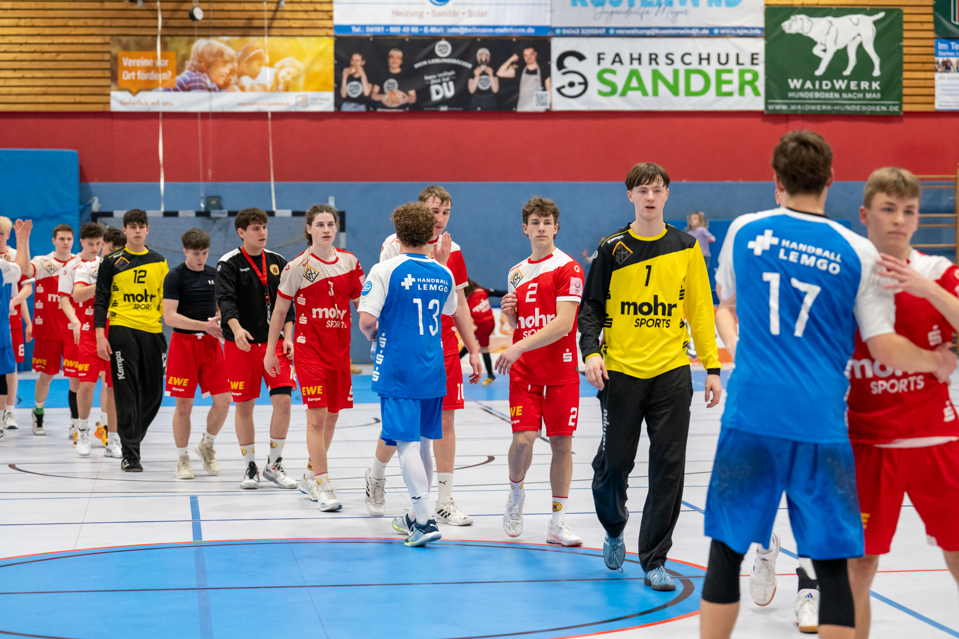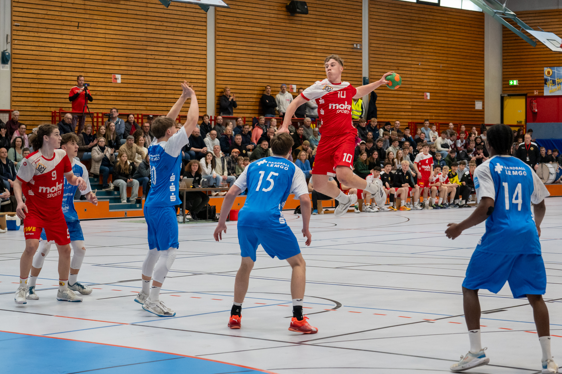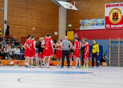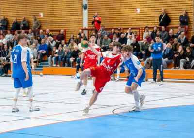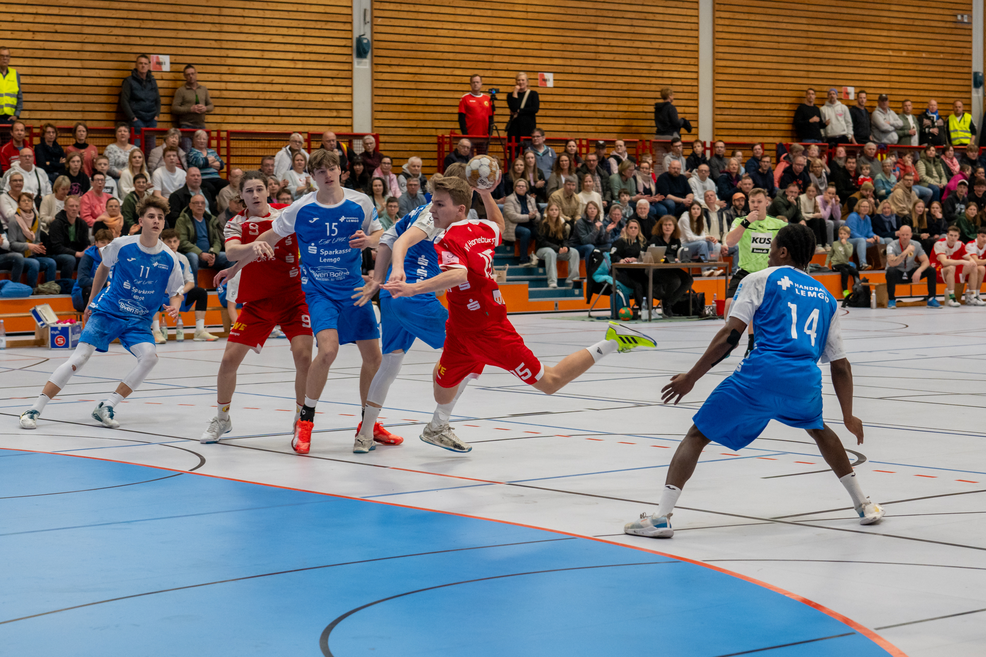 Einen am Ende ungefährdeten 46:37 (21:16) Heimsieg hat die A-Jugend gegen den Tabellendritten Lemgo eingefahren und bleibt damit zwei Spieltage vor Schluss weiterhin mit einem Punkt Vorsprung an der Tabellenspitze vor dem VfL Gummersbach. Das Horneburger Team spielte in der gut besuchten Sporthalle Hermannstraße sehr konzentriert und ging über die volle Spielzeit ein hohes Tempo. Luis Prochaska machte eine gute Partie im Tor und die starken Kreisläufer Malte Mauel (5) und Lev Schmidt (3) hielten die Deckung zusammen. Im Angriff überzeugte der sehr umsichtige Lasse Holtfreter (6) mit vielen richtigen Entscheidungen und Torjäger Malte Hagedorn (11) war wieder einmal nicht zu stoppen.
