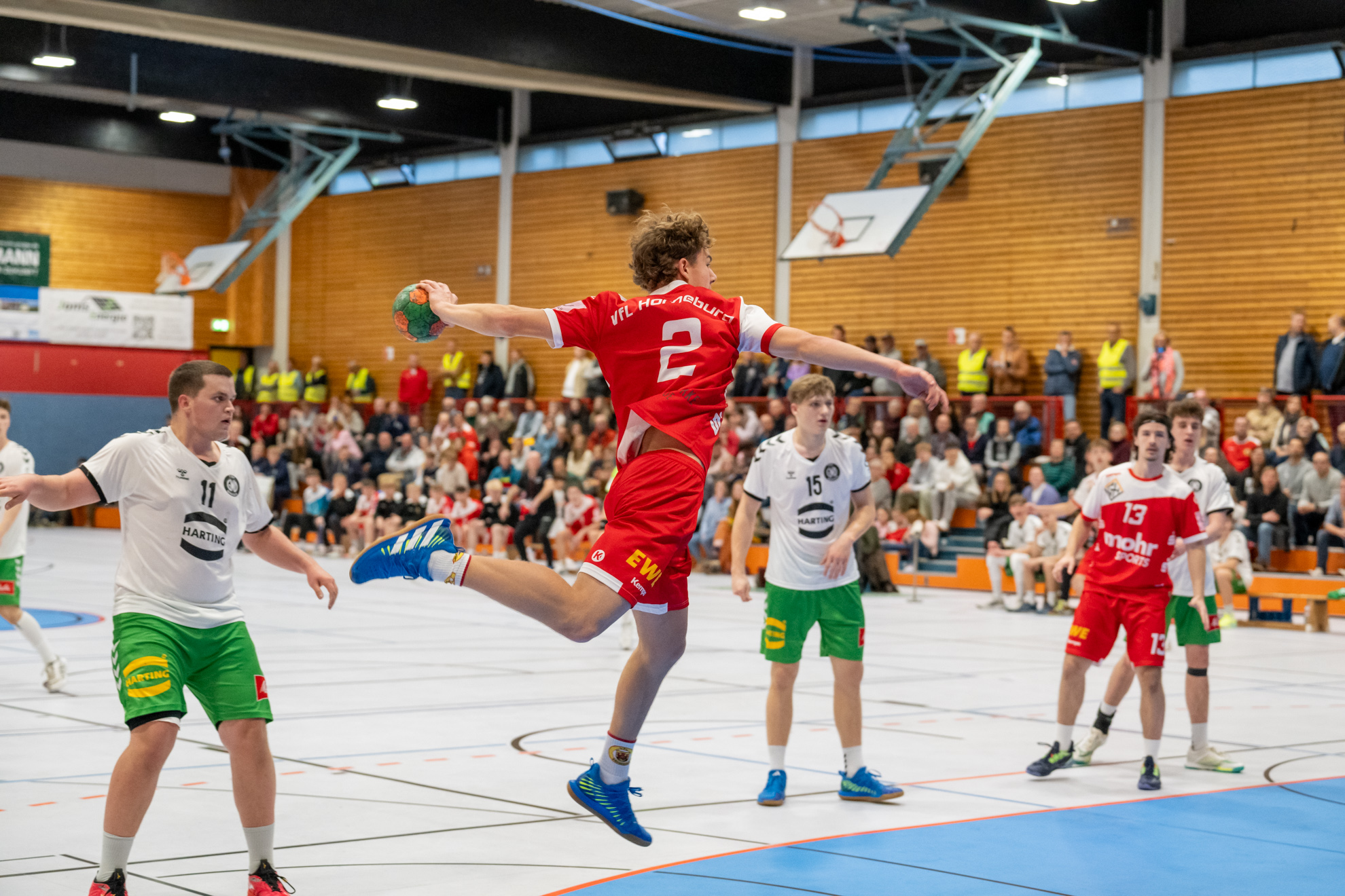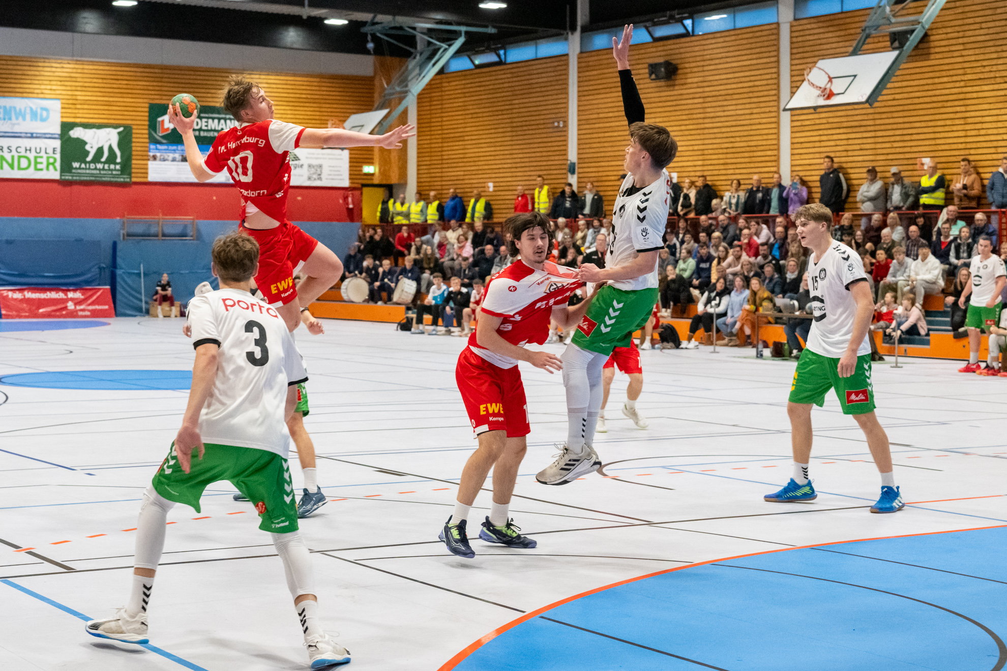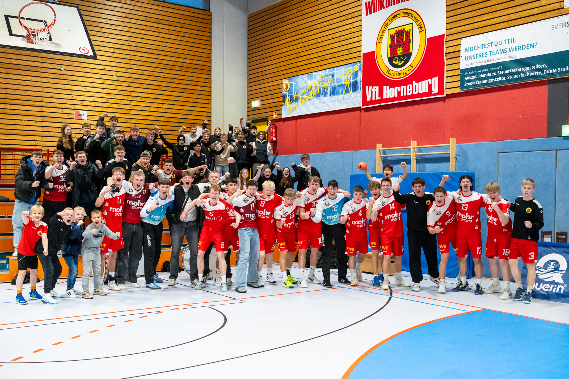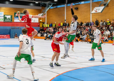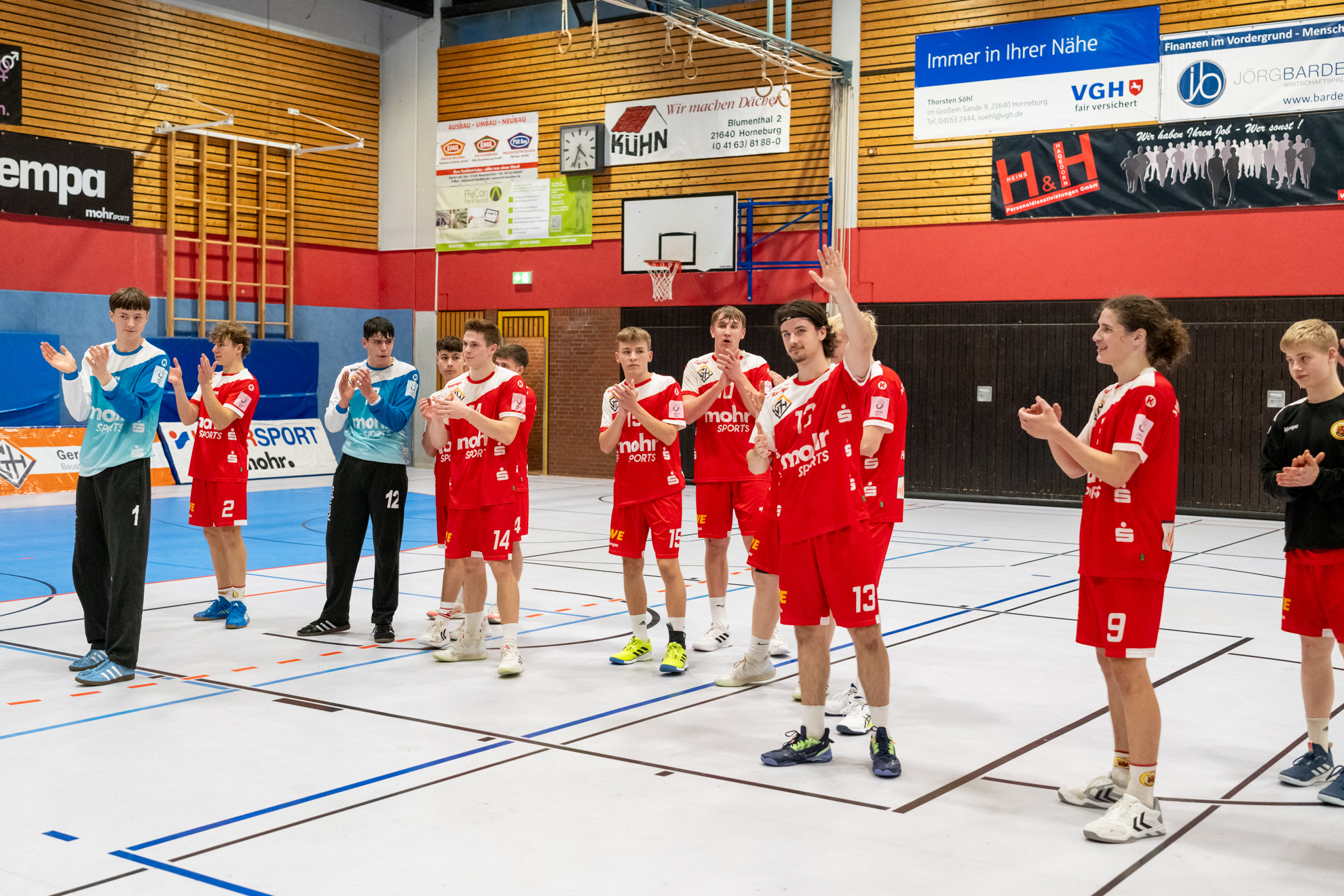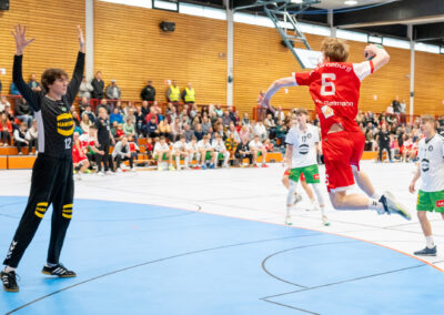 Nach der ersten Saisonniederlage in Lemgo ist das Team der Trainer Carsten Brinkmann und Stefan Hagedorn mit einem 27:26 (12:11) Heimsieg in die Erfolgsspur zurückgekehrt und hat die Tabellenführung behauptet. Das Horneburger Team legte mit einer starken Anfangsphase auf 5:1 vor, konnte allerdings dieses Spielniveau im weiteren Spielverlauf nicht halten. Mindens Trainerbank nahm einige Spielanpassungen vor und damit fanden die Gäste besser ins Spiel. Torjäger Malte Hagedorn (5) hatte fortan eine Manndeckung und Minden griff häufiger im 7:6 an. Es entwickelte sich ein Spiel, dass stark von der Kampfkraft geprägt und bis zur letzten Spielminute spannend blieb. Die Einwechselungen auf Horneburger Seite entschieden am Ende das Spiel für das Heimteam. Der sehr starke Erik Habermann hielt das Team mit seinen 6 Treffern im Spiel und auch Rechtsaußen Benjamin Cordes (3) wusste wie Lev Schmidt (1) am Kreis zu überzeugen. Der für den früh im Spiel verletzten Luis Prochaska ins Tor gekommene Theo Minners machte eine gute Partie und hielt wichtige Bälle.