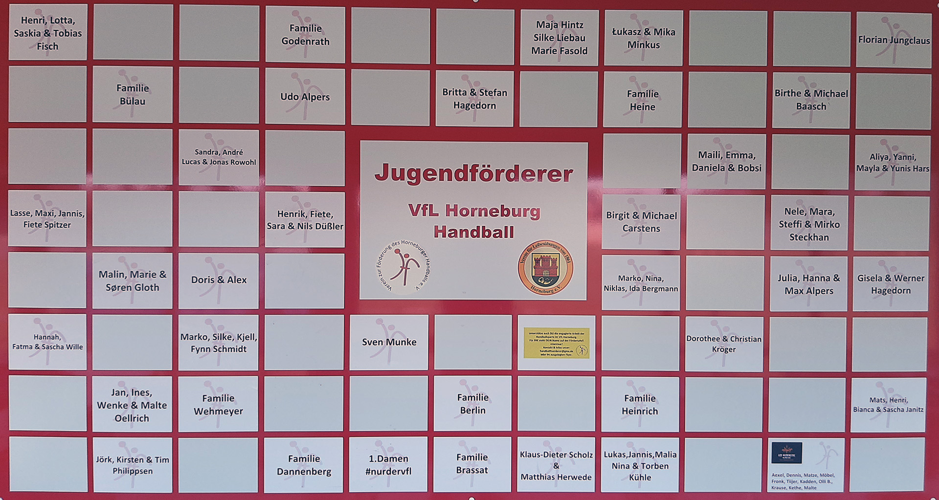 Die neue Fördertafel ist bereits mit ca. 40 Förderern und Förderinnen gefüllt. Es gibt noch einige weiße Flecken, die von künftigen Förderinnen oder Förderern besetzt werden können. Bei Interesse schickt einfach eine Mail an handballfoerderer@gmx.de Einen herzlichen Dank an alle, die dem Handball im VfL Horneburg die Treue halten.