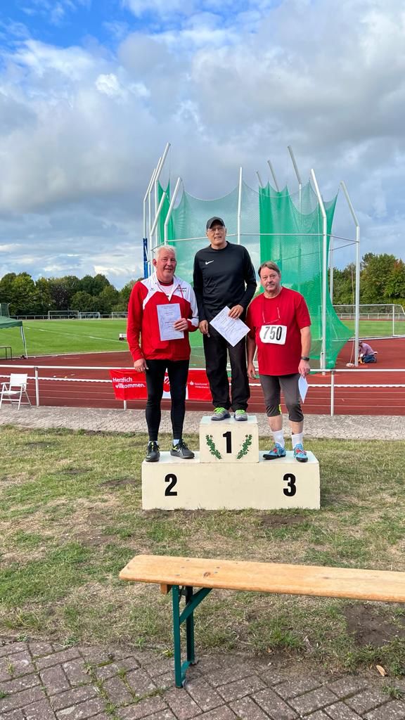 Die Athleten des VfL Horneburg setzten ihre Erfolgsserie bei den Niedersächsischen Landesmeisterschaften im Hammer- und Gewichtwurf fort. In Harsum bei Hildesheim traten Rüdiger Hülsmann und Jürgen Schulz an. Erfolgreichster Teilnehmer in der Altersklasse M60 war Rüdiger Hülsmann vom VfL Horneburg. Er wurde mit 37,32m Vize- meister vor seinem Vereinskollegen Jürgen Schulz, der mit 35,07m Dritter wurde. Beide brachten den späteren Sieger Rudolf Hillebrecht (Bad Gandersheim) arg in Bedrängnis. Hülsmann gewann anschließend das Gewichtwerfen mit 14,25m vor Jürgen Schulz, der nach dem ertsen Versuch verletzungsbedingt abbrechen musste. Auf dem Bild sehen Sie: Links Rüdiger Hülsmann, Mitte Rudolf Hillebrecht, rechts Jürgen Schulz.