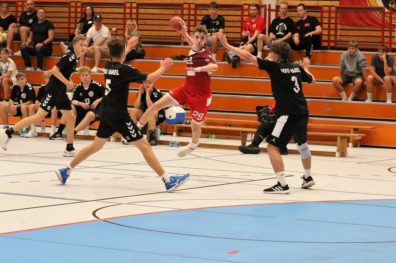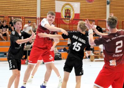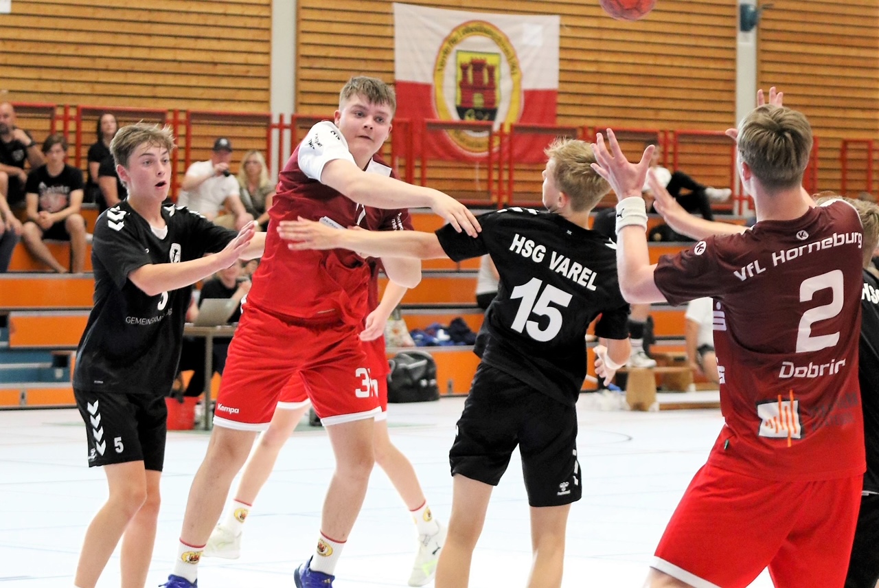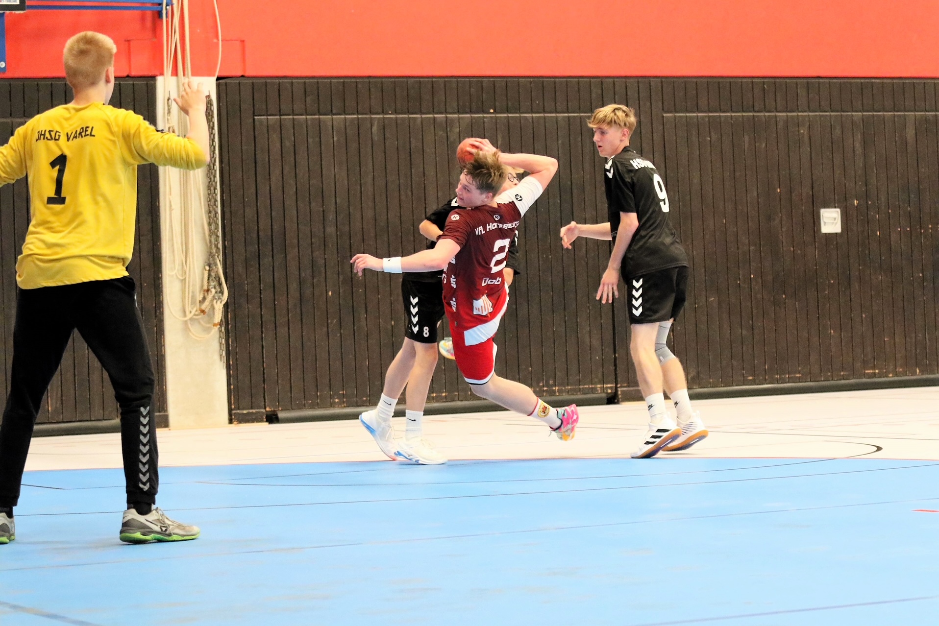 In Halbzeit zwei kam dann die Galavorstellung von Łukasz Minkus, der direkt zuvor mit seiner mJc den HC Bremen niedergerungen hat.  Wenn er in Halbzeit eins in zehn Minuten Spielzeit drei Tore markieren konnte, sollten in Halbzeit zwei noch sieben weitere dazu kommen. Trotzdem wurde auch im zweiten Durchgang auf Augenhöhe um jeden Ball gekämpft. In Minute 37 waren die Vareler auch wieder bis auf ein Tor ran. Zehn Minuten vor Schluss konnten unsere Horneburger Jungs ihren Vorsprung erstmals  auf vier Tore ausbauen. In der 48igsten und 49igsten Minute konnte Colin Dobrick noch die letzten beiden Tore für Horneburg markieren. Nach 50 intensiven Minuten stand es dann 35:28 für Horneburg. Mit diesem Sieg konnte die Tabellenführung in der Landesliga Nord nach dem zweiten Spieltag behauptet werden.