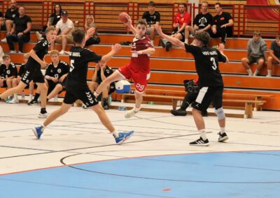 Kurz vor dem Pausenpfiff konnten unsere Horneburger Jungs dann dank zwei verwandelter 7 Meter innerhalb von nur 50 Sekunden mit einer zwei Tore Führung in die Halbzeit gehen.
